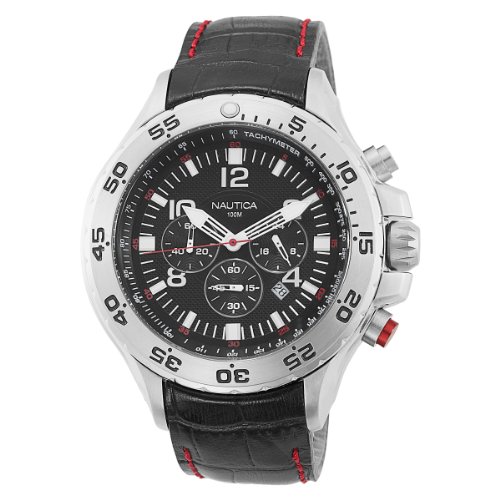 The Nautica Men's NST Chronograph Watch features three unique subdials for enhanced utility. Constructed with a stainless steel case, the timepiece includes a unidirectional stainless steel bezel with Arabic minute index etchings, and a comfortable black wristband with red accent stitching and an adjustable buckle clasp. A tough mineral window shields the black dial, which features bold white hour markers capped with red Arabic numeral indexes that clock the minutes in increments of five. The dial is encircled by a white tachymeter and includes white minute indexes, a date calendar at four o'clock, and three white chronograph subdials. Powered by analog-quartz movement, the watch is water resistant to 330 feet.Amazon.com Product Description